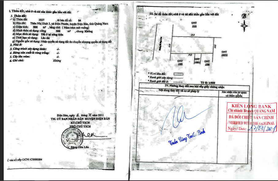 - Tài sản tọa lạc tại thửa đất số 1027, Tờ bản đồ số 04, Thôn Nhị Dinh 3, Hẻm chính, ĐT 609, Xã Điện Phước, TX Điện Bàn, Quảng Nam (nay thuộc xã Điện Bàn Tây, TP Đà Nẵng). Tài sản nằm vị trí 1 đường có bề rộng từ 2m đến dưới 3m thuộc xã Điện Phước. Phía trước giáp đường bê tông rộng 2.5m (cả lề). Cách đường ĐT 609 #70m. Bên trái tài sản có trụ điện. Tài sản nằm ở hẻm cụt, có một lối vào duy nhất.
