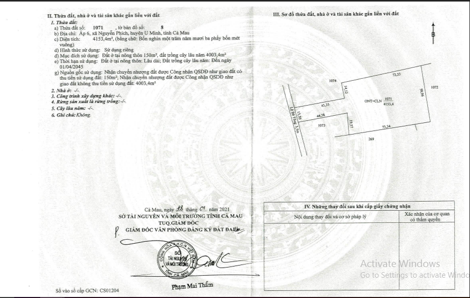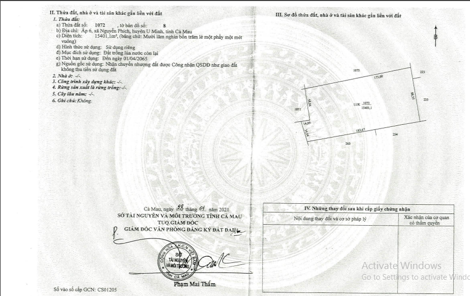 - Tài sản là 2 thửa đất số 1071; 1072 - Tờ bản đồ 8. Tọa lạc tại: ấp 6, Lộ nông thôn, Xã Nguyễn Phích, Huyện U Minh, Cà Mau. Tài sản là 2 thửa liền kề tạo thành khối thống nhất không thể tách rời, tọa lạc mặt tiền Lộ Tuyến Sông Cái Tàu (đường bê tông rộng 3,5m). Đoạn Bờ Bắc Bảy Hộ đến Bờ Nam Ông Khẹn. Tài sản cách cầu Khai Hoang #2,2km.