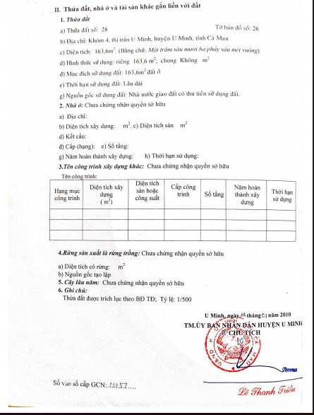 - Tài sản tọa lạc tại thửa đất số 28 - Tờ bản đồ số 26, Khóm 04, TT U Minh, Huyện U Minh, Cà Mau (nay là xã Nguyễn Phích, tỉnh Cà Mau). Tài sản có mặt tiền lộ bê tông R#3m cập Kinh 12, cách chợ U Minh #90m, cách đường Đỗ Thửa Luông #200m, cách Trường Tiểu Học Nguyễn Văn Huyên #350m.
