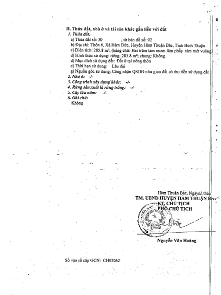 - Tài sản tọa lạc tại thửa đất số 30, Tờ bản đồ số 92 (nay thuộc Xã Hàm Thuận, Tỉnh Lâm Đồng), Thôn 6, Khác, Xã Hàm Đức, Huyện Hàm Thuận Bắc, Bình Thuận. Tài sản tọa lạc tại khu VT2, xã Hàm Đức - Mặt trước giáp đường bê tông rộng #3m - Cách Quốc lộ 1A #35m, cách Trường tiểu học Hàm Đức #450m.