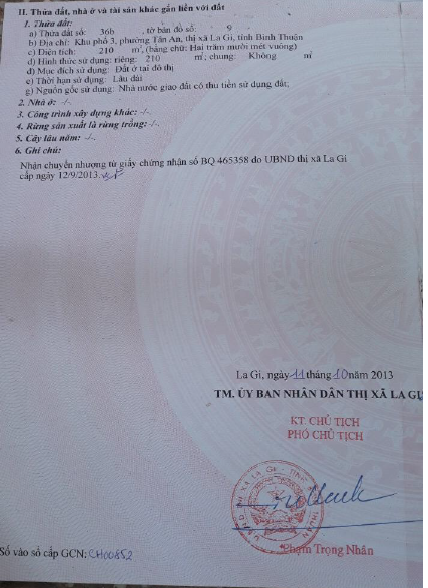 - Tài sản tọa lạc tại thửa đất số 36b - Tờ bản đồ số 9, KP3, hẻm phụ, Ngô Quyền, Phường Tân An, TX La Gi, Bình Thuận. Tài sản nằm tại hẻm cấp 2, vị trí 2 của Ngô Quyền - Mặt tiền giáp đường bê tông rộng 2.5m - Cách hẻm chính khoảng 30m. Cách ngã 3 đường Ngô Quyền - Lý Nam Đế khoảng 500m. Khu dân cư hiện hữu.