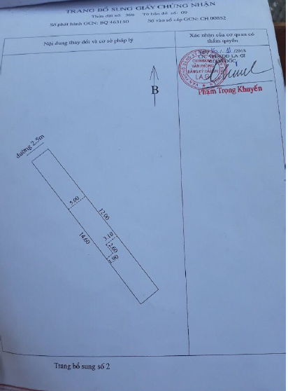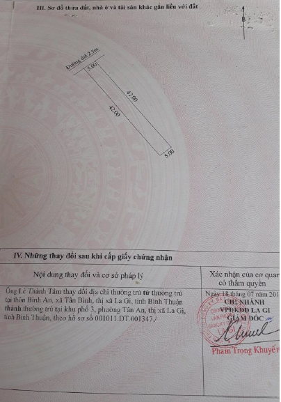 - Mô tả đất: Diện tích đất: 210m2 ODT - Hướng: Tây Bắc - Kích thước và hình dáng: + Chiều rộng: 5m + Chiều dài: 42m + Chiều rộng giáp đường: 5m + Hình dáng: Vuông vức, không cân đối - Tiếp giáp: + Mặt trước: Đường bê tông + Các mặt còn lại thửa khác - Căn cứ Quyết định số 1666/QĐ-UBND theo đồ án Quy hoạch phân khu Khu vực Tây Sông Dinh, thị xã La Gi, tỉnh Bình Thuận. TSTĐ được dự kiến định hướng chức năng (01) là Đất giao thông, (02) là Đất giáo dục theo quy hoạch.