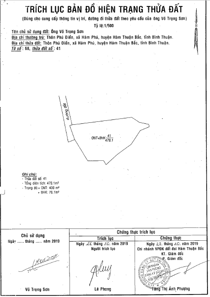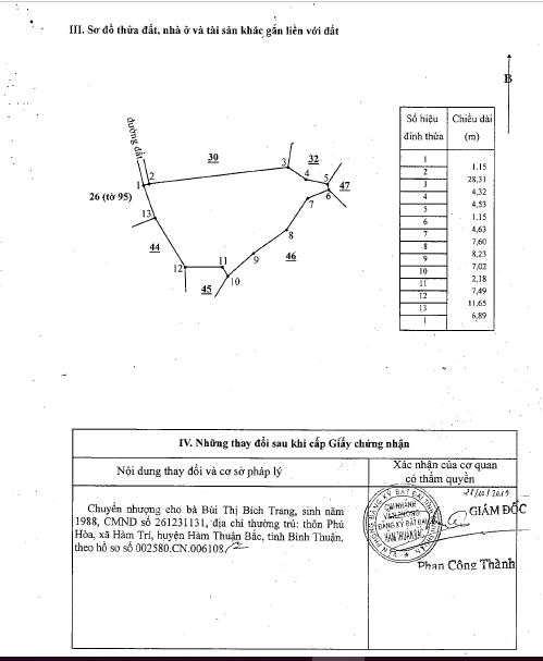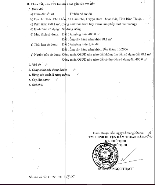 - Tài sản tọa lạc tại thửa đất số 41, Tờ bản đồ 68 (Nay thuộc xã Hàm Thuận Bắc, tỉnh Lâm Đồng), Thôn Phú Điền, Xã Hàm Phú, Huyện Hàm Thuận Bắc, Bình Thuận. Tài sản toạ lạc vị trí 5 khu vực 1 xã Hàm Phú, huyện Hàm Thuận Bắc - Mặt tiền giáp đường đất rộng #1.15m - Nằm tại hẻm phụ và cách đường liên xã Hàm Phú - Thuận Minh #120m, cách hẻm chính (bê tông rộng #2.5m) #50m, cách Chợ Phú Điền #900m - Hẻm đâm một phần và cuối hẻm cụt.