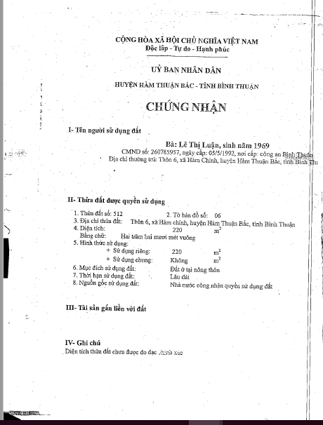 - Tài sản tọa lạc tại thửa đất số 512 - Tờ bản đồ số 06, Thôn 6, Xã Hàm Chính, Huyện Hàm Thuận Bắc, Bình Thuận. Tài sản thuộc đường Liên xã (nhựa, rộng khoảng 6m), có trụ điện nằm ngay gốc đất và thấp hơn đường khoảng 20cm, nằm cách Quốc lộ 28 khoảng 1km, khu dân cư đông...
