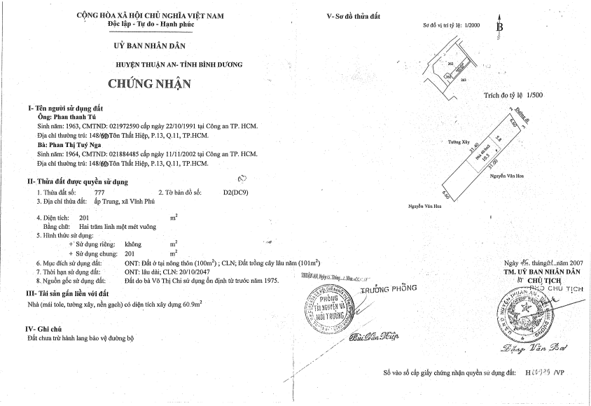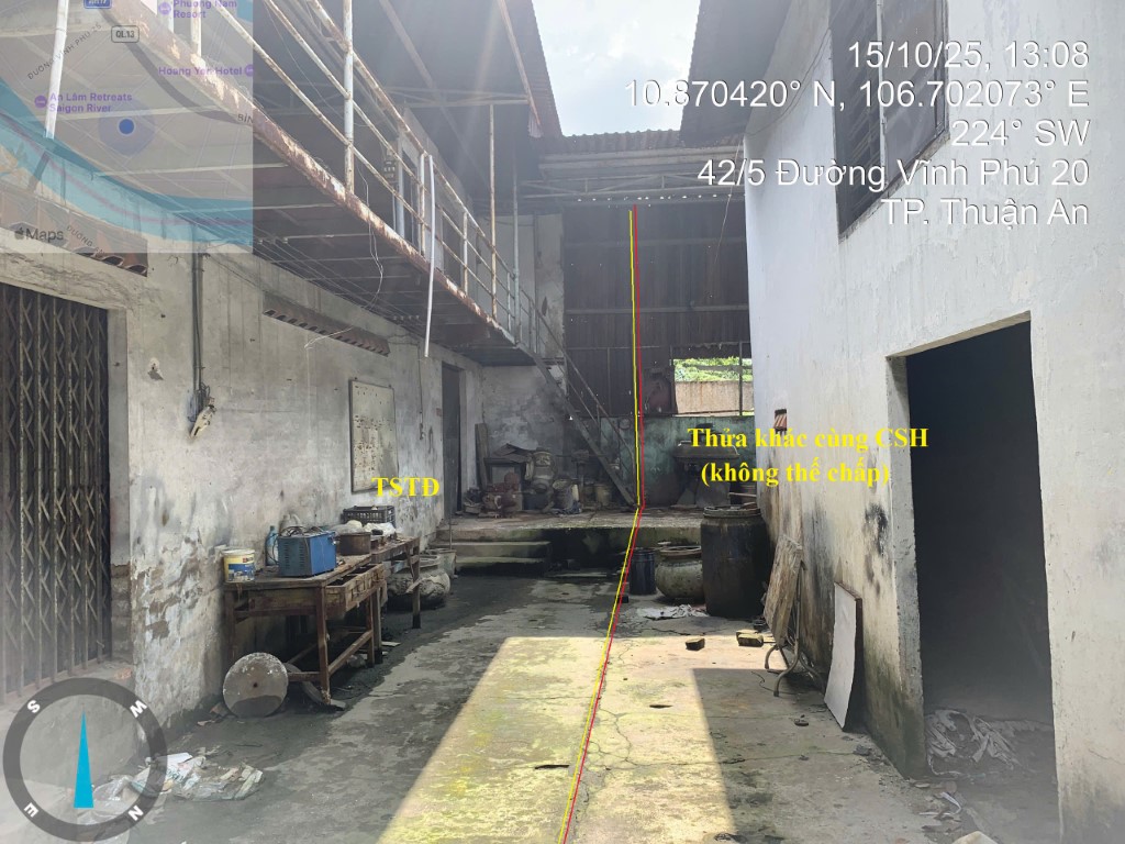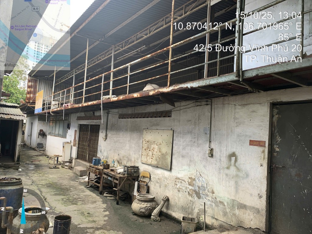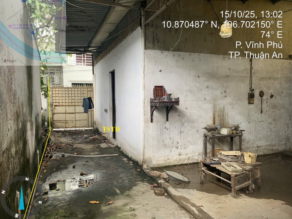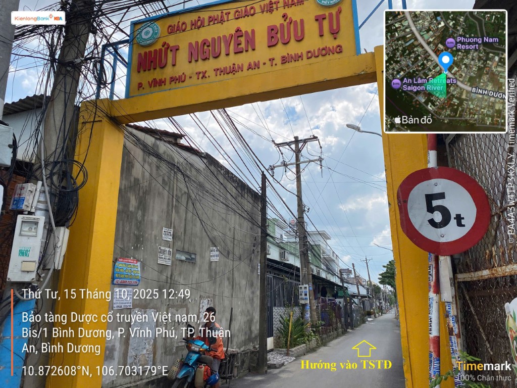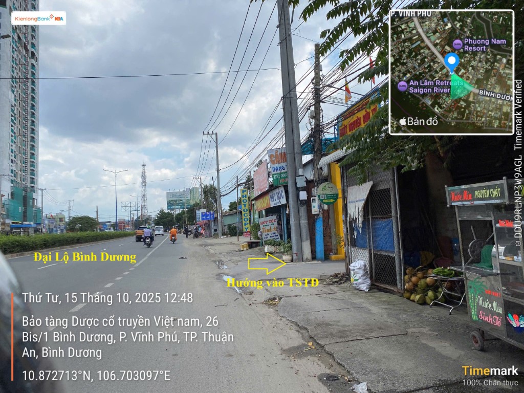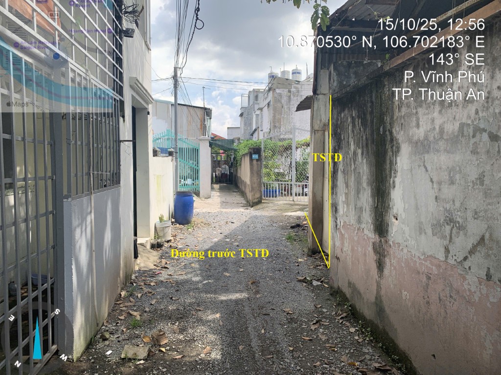 - Tài sản tọa lạc tại thửa đất số 777 - Tờ bản đồ D2(DC9) hẻm phụ, Vĩnh Phú 20, Phường Vĩnh Phú, TX Thuận An, Bình Dương (nay là phường Lái Thiêu, TP Hồ Chí Minh). Tài sản tọa lạc tại hẻm phụ đường Vĩnh Phú 20 (hẻm đất đá, rộng khoảng 3m, đoạn hẹp nhất trước khi đến tài sản rộng khoảng 2.5m). Tài sản cách đường Vĩnh Phú 20 khoảng 160m, cách Nhứt Nguyên Bửu Tự khoảng 190m, cách Đại Lộ Bình Dương khoảng 320m. Khu vực dân cư hiện hữu.