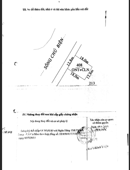 - Mô tả tài sản: Diện tích: 229,4m2 (trong đó Đất ở: 124m2 ; Đất trồng cây lâu năm: 105,4m2) Kích thước Rộng x Dài:12,8m x 18m. Đất có hình dạng: Vuông vắn - Hướng chính: Tây Bắc - Mặt trước tiếp giáp với: sông Chủ Biện - Mặt sau tiếp giáp với: Đất dân và lối đi chung - Bên trái tiếp giáp với: Đất dân - Bên phải tiếp giáp với: Đất dân.