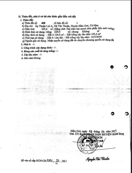 - Tài sản tọa lạc tại thửa số 408 - Tờ bản đồ 1 - ấp Thuận Lợi A, Khác, Xã Tân Thuận, Huyện Đầm Dơi, Cà Mau. Tài sản ở vị trí mặt tiền sông Chủ Biện (đoạn Ngã Tư Ông Rum về các hướng 200m), có lối đi chung R#1m đi vào, cách lộ bê tông R#3m về bến phà 2 Hạt #40m. Từ PGD Đầm Dơi -> hướng đi Đầm Dơi - Tân Thuận (lộ Đông Tây) đến cầu Chủ Biện, qua cầu rẽ trái đi lộ bê tông R#2,5m đến cầu Ông Rum, qua cầu rẽ trái đi theo lối đi chung (đường đất R#1m) #40m.