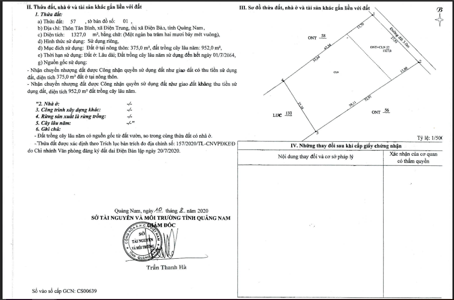 - Mô tả đất: Diện tích theo GCN: 1.327m2 (trong đó + Phần diện tích đất cân đối: 837.9m2 (kích thước cân đối RxD: 27.93m x 30m). Bao gồm: * Đất ONT cân đối: 375 m2 * Đất CLN cân đối: 462.9 m2 .Phần diện tích thuộc đất CLN không cân đối còn lại: 489.1m2. + Chiều rộng: 27.93m - 25.38m + Chiều dài: 47.34m - 52.91m. Mặt tiền tiếp giáp lối đi: 27.93m. Hướng: Đông Bắc. Hình dáng: Tương đối vuông vức, Không cân đối. Tài sản tiếp giáp: Phía trước giáp Đường liên xóm. Phía sau giáp đất lúa. Phía bên phải giáp nhà hoang + đất trống. Phía bên trái giáp đất trống. Tài sản đang được sử dụng để trồng chuối. Có tường rào bằng gạch ngăn cách. Có mốc cắm của địa chính để xác định ranh giới đất.